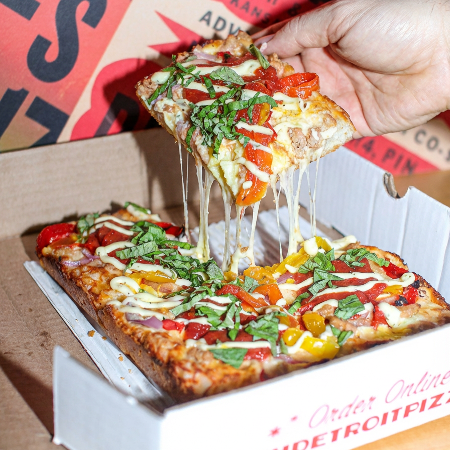 It’s square. It’s reversed. It’s deep dish. Brick cheese is spread to the edges of the dough and as the pie bakes, the cheese melts down the sides creating a crispy, thick and chewy Sicilian crust. Our fire-roasted tomato sauce is layered over the cheese and topped with other deliciousness, thus creating the classic Detroit style pizza.